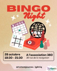 Ça faisait trop longtemps, le voilà de retour : c’est l’heure du loto ! Retrouve Esma et Val mardi 14 novembre à l’asso 360 (Rue de la Navigation 36) de 18h30 à 21h30. On fournit les grilles et de quoi grignoter.