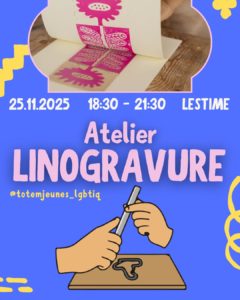 Le mardi 25 novembre, on vous propose un atelier LINOGRAVURE, tu vas pouvoir faire ta propre création (que tu peux préparer en amont (un croquis ou une image) ou simplement le préparer sur place) et en faire plusieurs impressions pour vous ou pour offrir. Peut-être une chouette idée de cadeau. 🎁