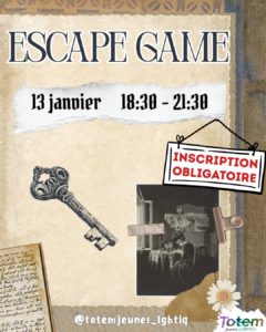 Le mardi 13 janvier, viens participer à un Escape Game : en équipe, relève des défis, résous des énigmes et plonge dans une aventure ludique et captivante.