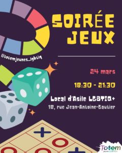 Ce mardi 24 mars, Lyd et Julien te proposent une soirée jeux de société dans les locaux d’Asile LGBTIQ+ (18 rue Jean-Antoine-Gautier, 1201 Genève) à 18h30.